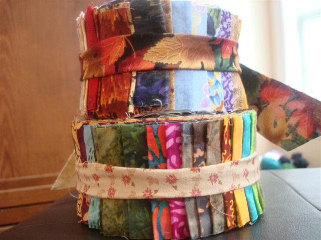 I joined (yet another) Yahoo group that focuses on stashbuilding (you probably recall prior posts where I mention my stashbusting groups), quite often through swapping and not buying. I found a willing swap partner, and we settled on a 2.5" strip swap. On the top is a 20-strip roll of miscellaneous fabrics, and on the bottom is a 40-strip roll of batiks. This is an absolutely ingenious way to add more variety to your stash without spending any money (except for postage), and without increasing the size of your stash, as well.